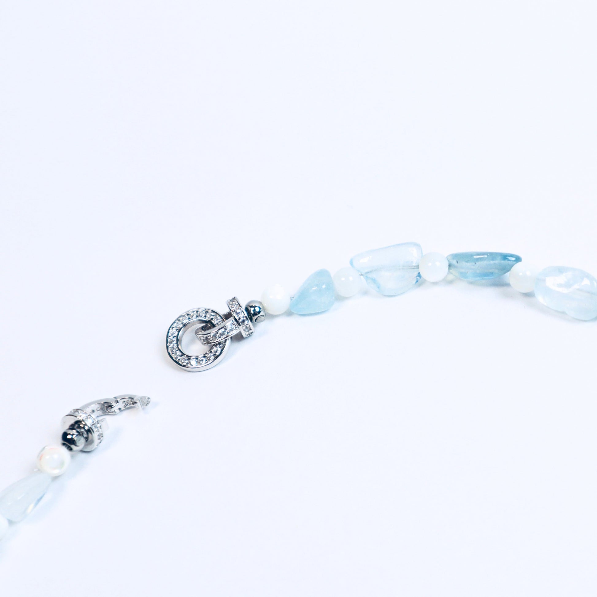 This elegant necklace features a beautiful blend of aquamarine beads and pearls, perfect for adding a touch of serenity to your look. The 40 cm length and sparkling 925 silver clasp with cubic zirconia make it a versatile and timeless accessory.