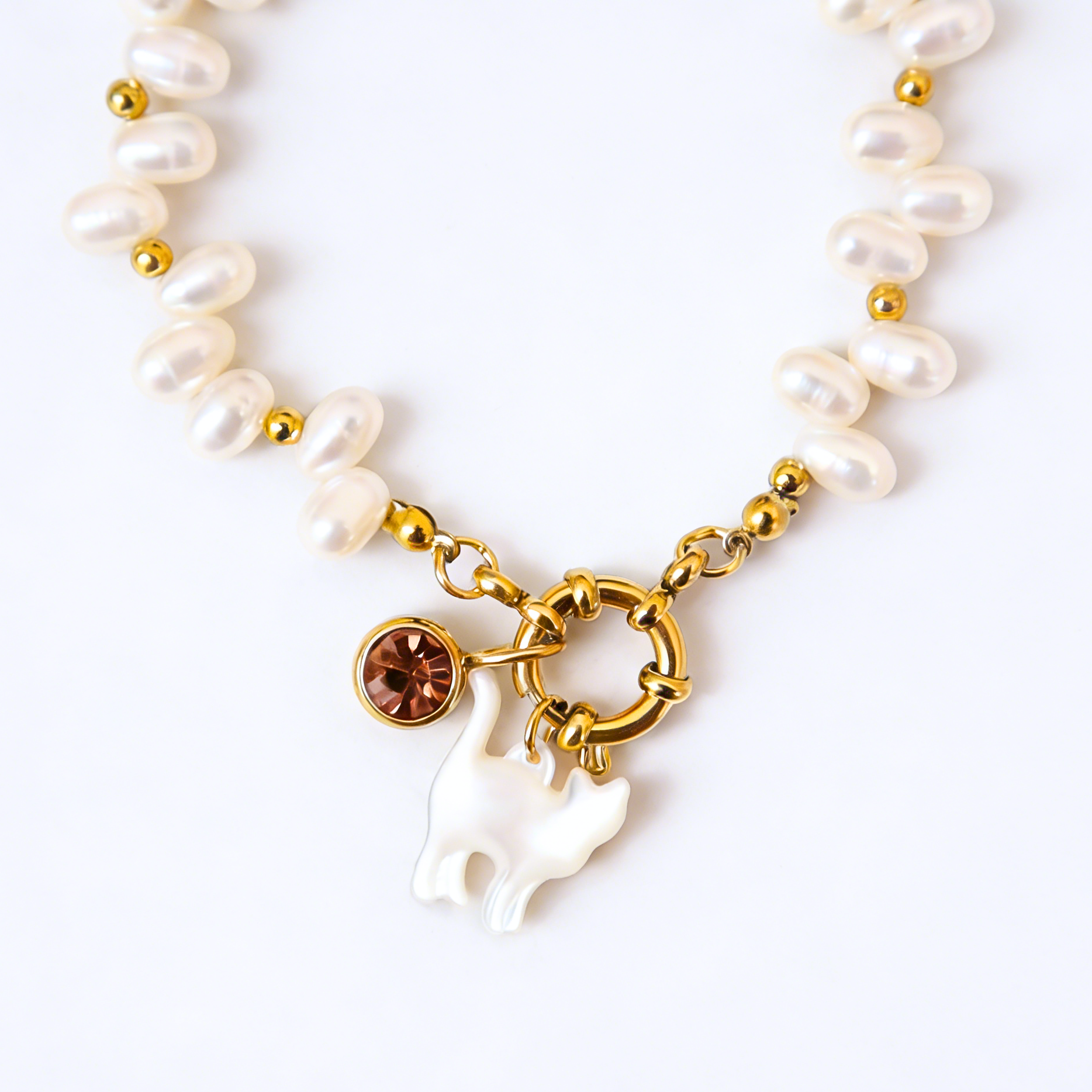 This pearl bracelet combines classic freshwater pearls with a modern gold finish and a subtle cat charm. Designed to feel light, warm, and effortless — perfect for daily wear or as a thoughtful gift.