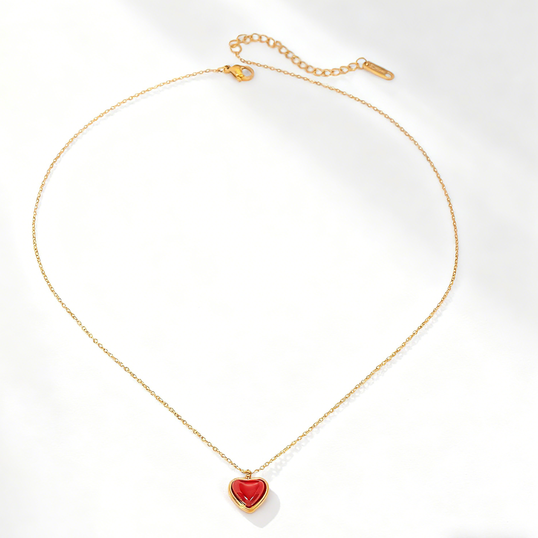 - A simple, everyday heart necklace with a smooth red agate center and a fine gold-toned chain.