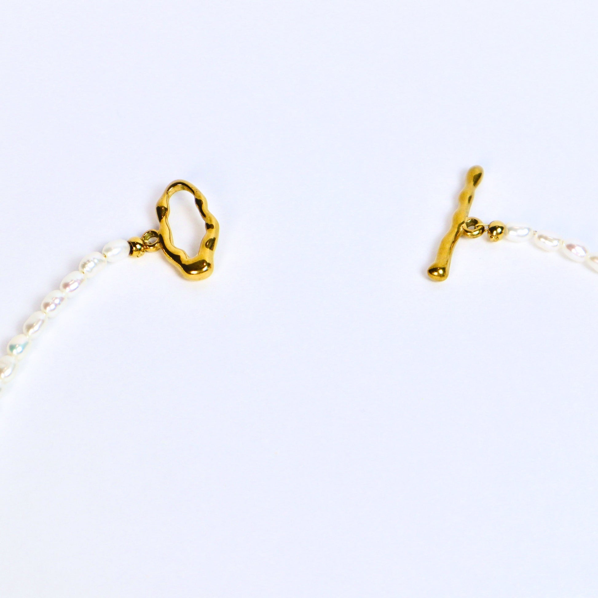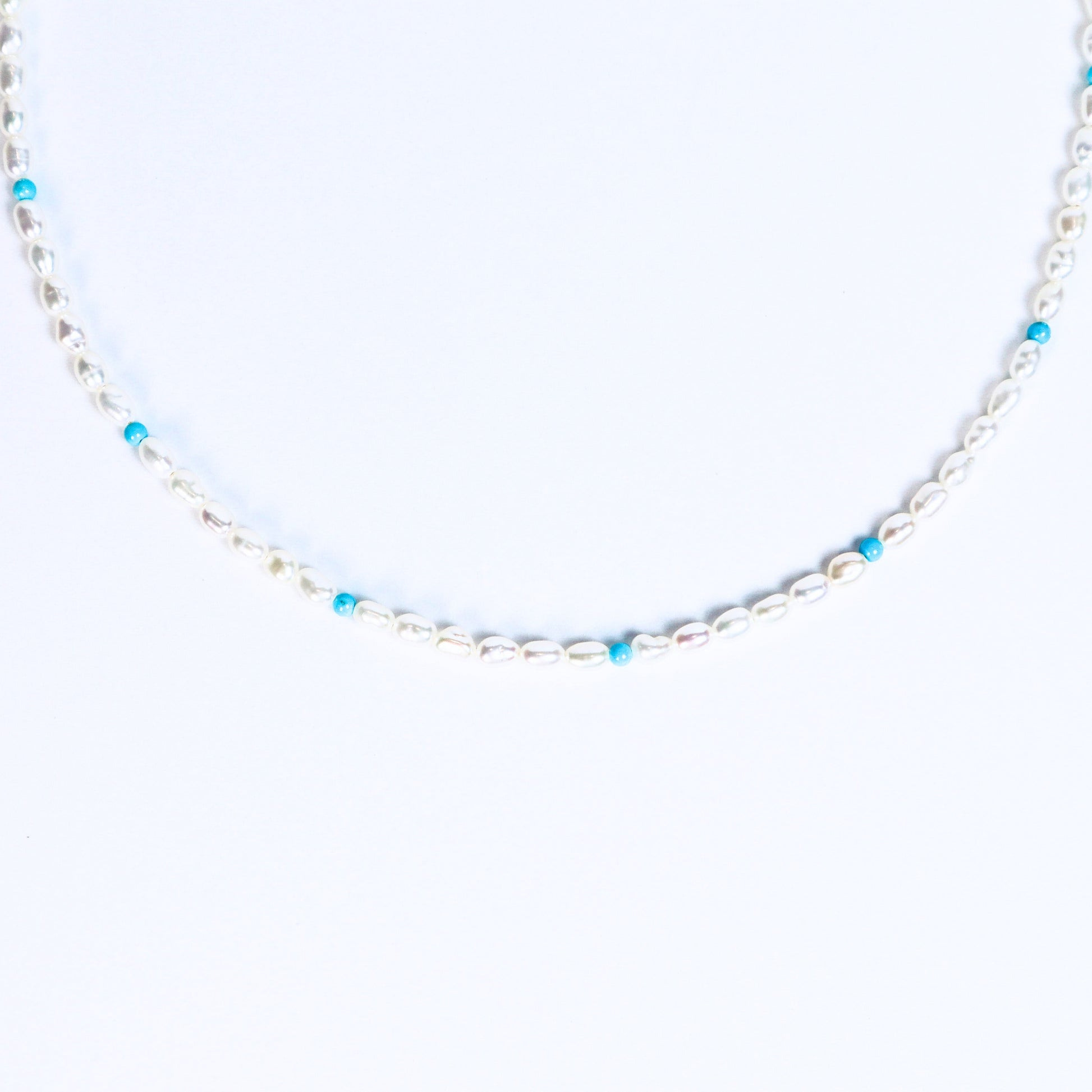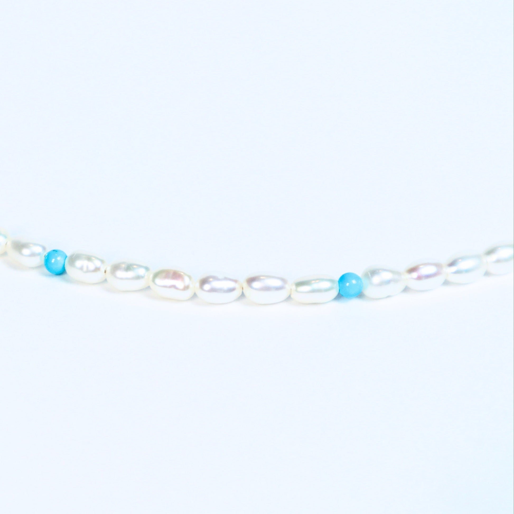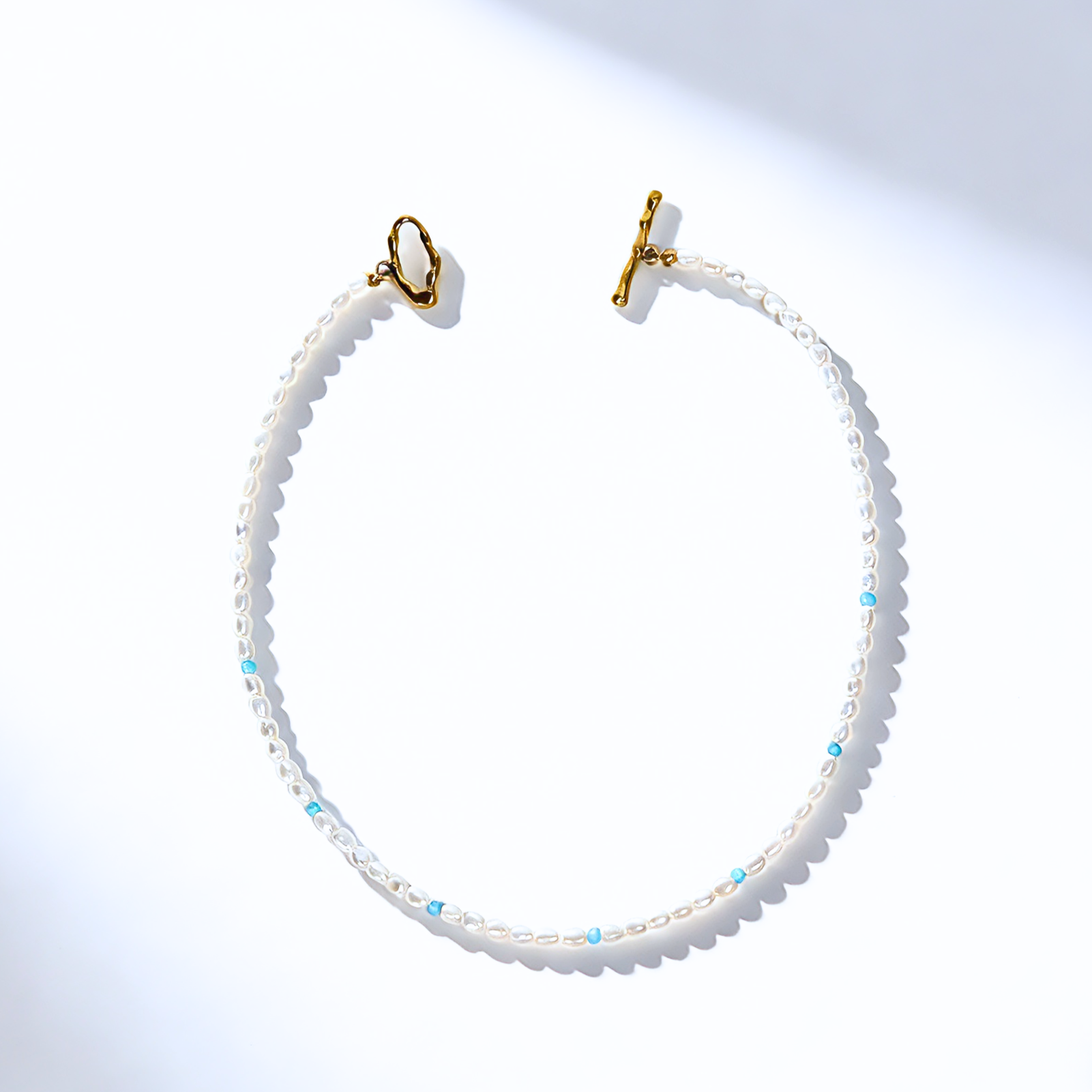 This charming necklace features small pearls paired with vibrant turquoise, enhanced by an OT clasp made from PVD 18K gold-plated. At 40 cm in length, it offers a perfect balance of elegance and color, ideal for everyday wear.